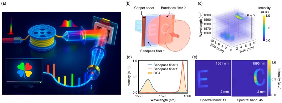 图 (a) 时间拉伸单像素高光谱成像概念图; (b-e) 红外高光谱成像性能表征.