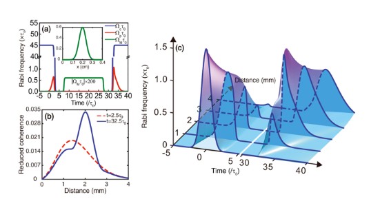 图2有微波场输入情况下表面极化激元的存储与读取。(a) 在位置处,表面极化激元脉冲,控制光场和微波场的时序包络。插图为微波场关于位置的空间分布函数;(b) 量子发射体的相干性关于位置的函数关系;(c) 在存储与读取期间,介质中表面极化激元包络随距离和时间的演化过程。