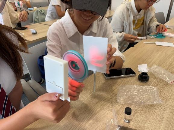 在互动实验环节,由物理与电子科学学院陈丽清副院长、黄蕊老师带领的追光科学社与同学们进行了动手小实验的互动,同学们分组体验了“光的偏振与量子通信”“水球凸透镜”等趣味实验,通过亲手操作加深了对抽象光学原理的理解。现场气氛活跃,讨论热烈,不少学生表示“第一次如此直观地感受到科学与实验的紧密联系”。